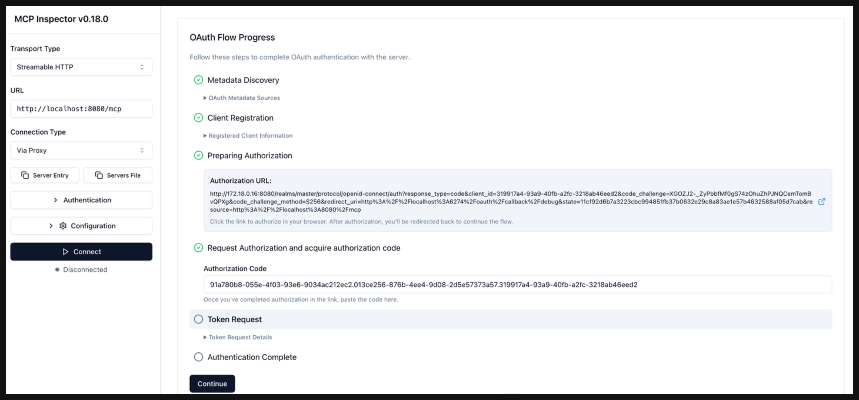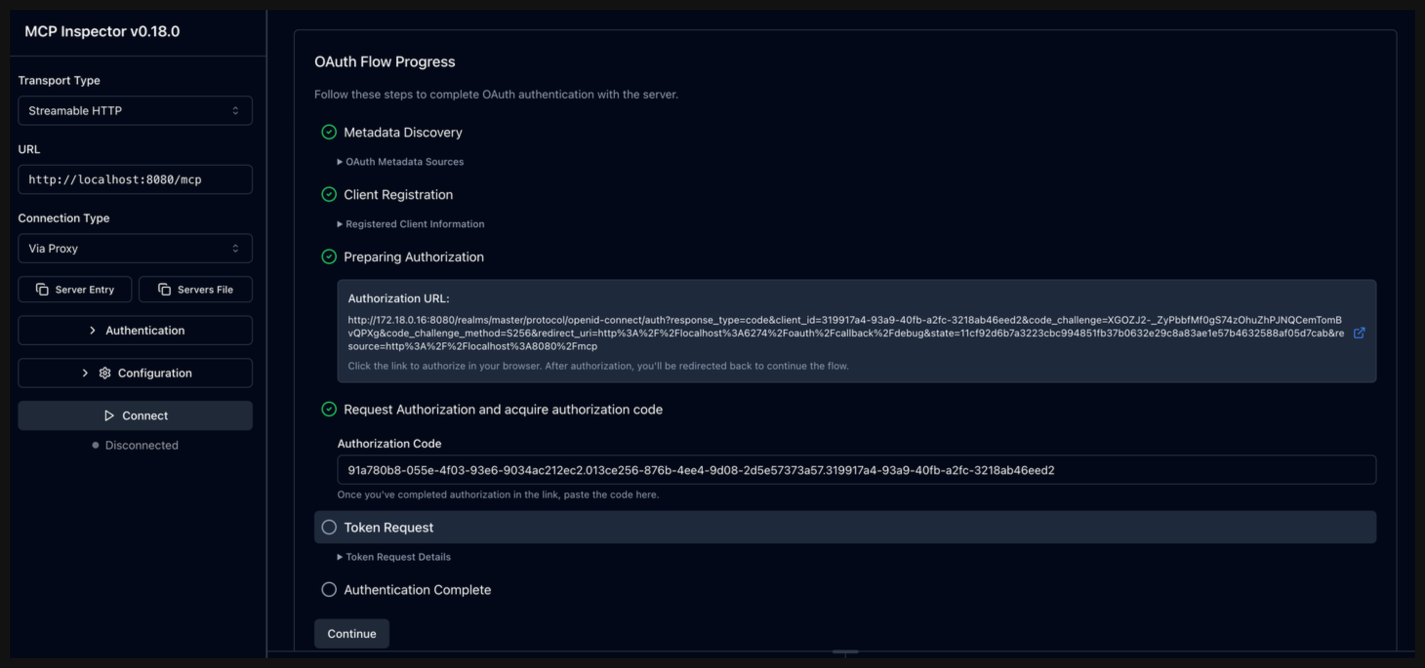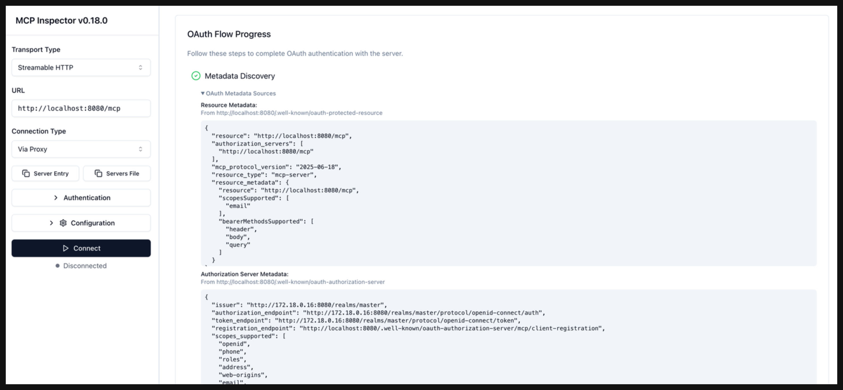 In the OAuth Flow Progress card, click Continue to start the Metadata Discovery phase. Verify that the step succeeds and that you see the authorization server metadata. The metadata include information about the location of the authorization server, supported scopes, and ways to provide the bearer token.