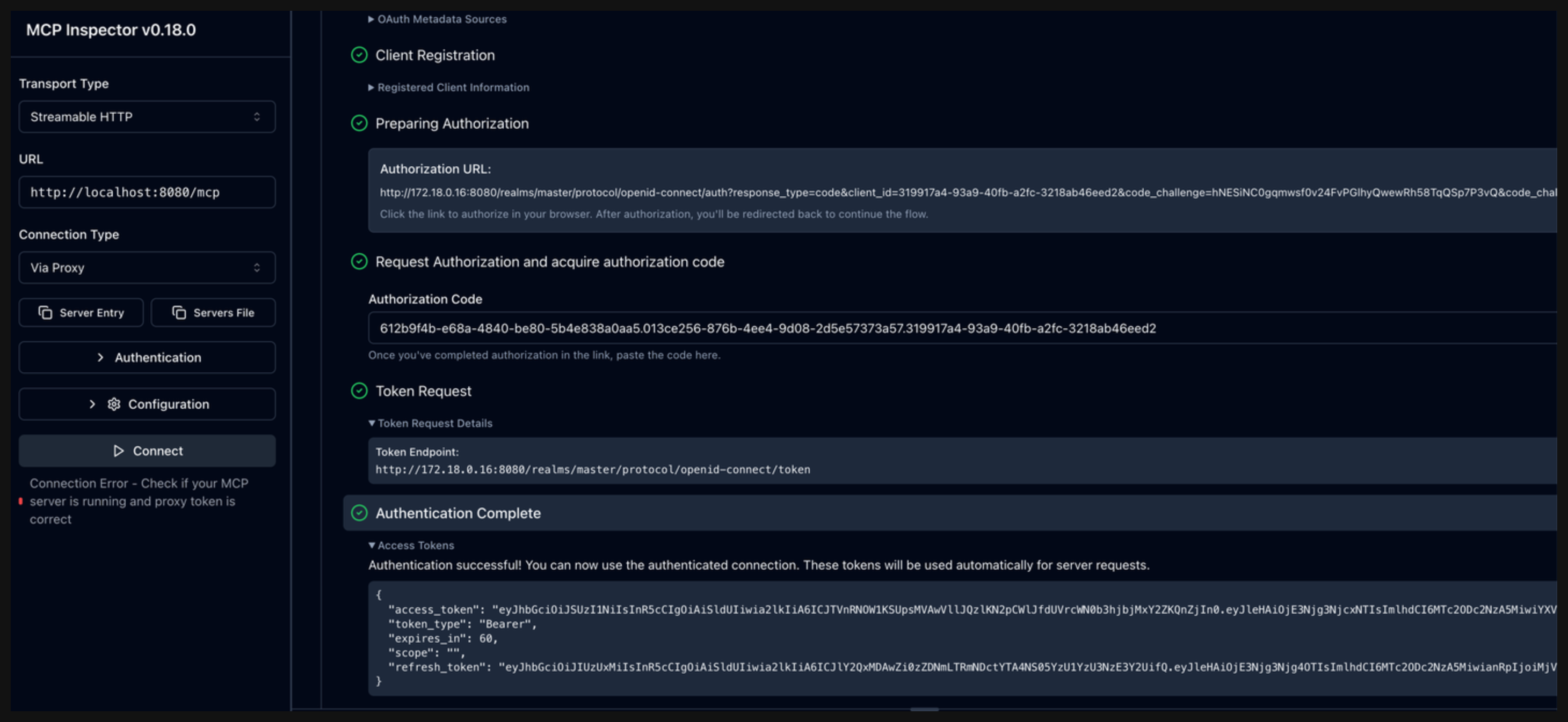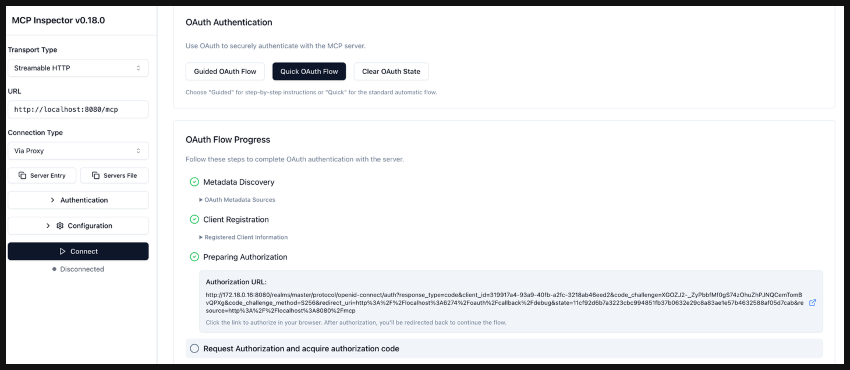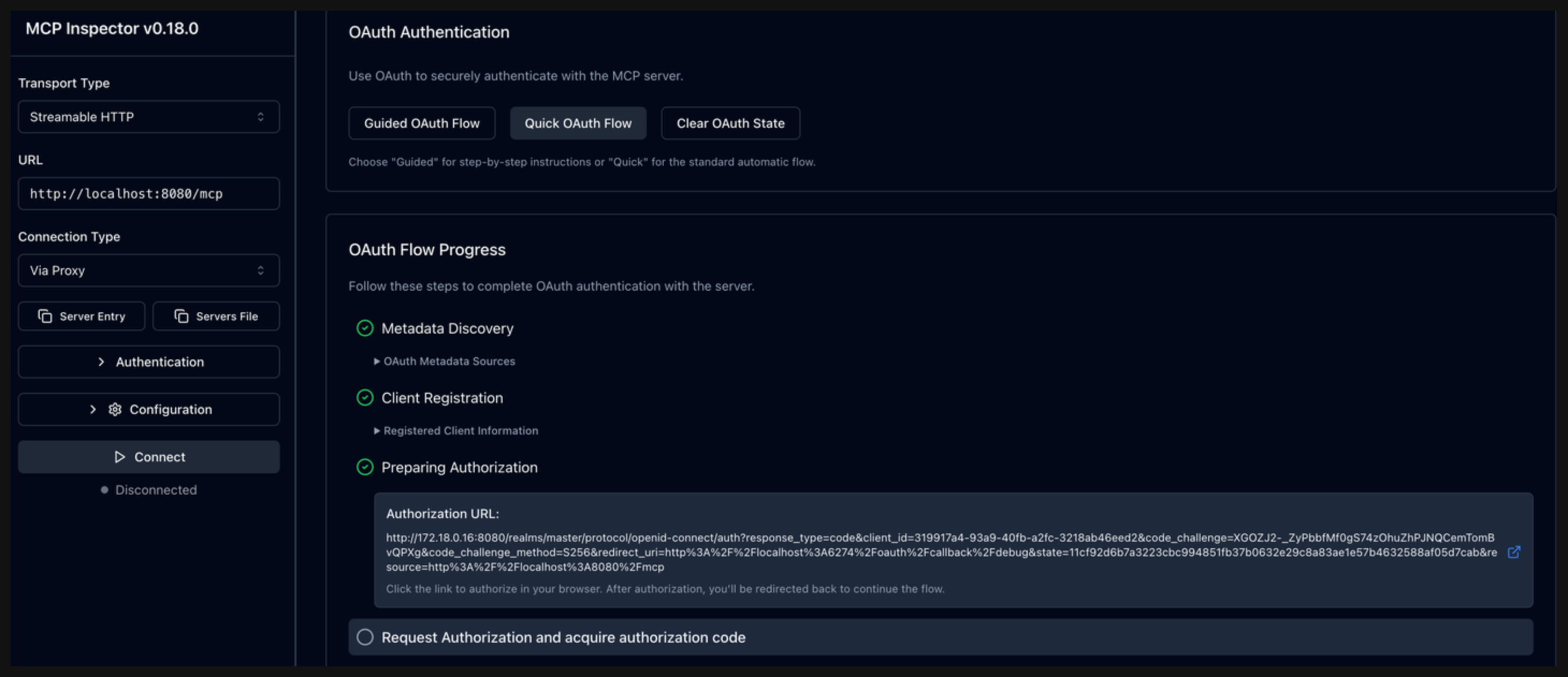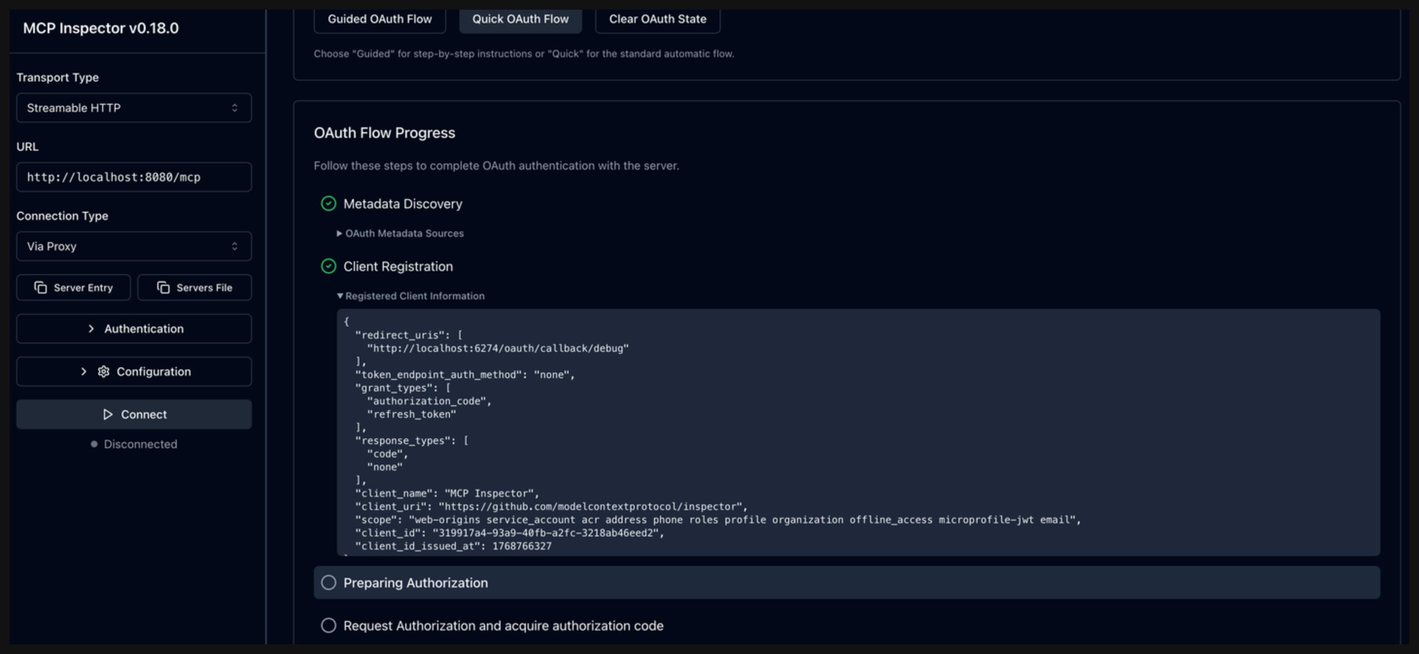 In the OAuth Flow Progress card, click Continue to start the Metadata Discovery phase. Verify that the step succeeds and that you see the authorization server metadata. The metadata include information about the location of the authorization server, supported scopes, and ways to provide the bearer token.