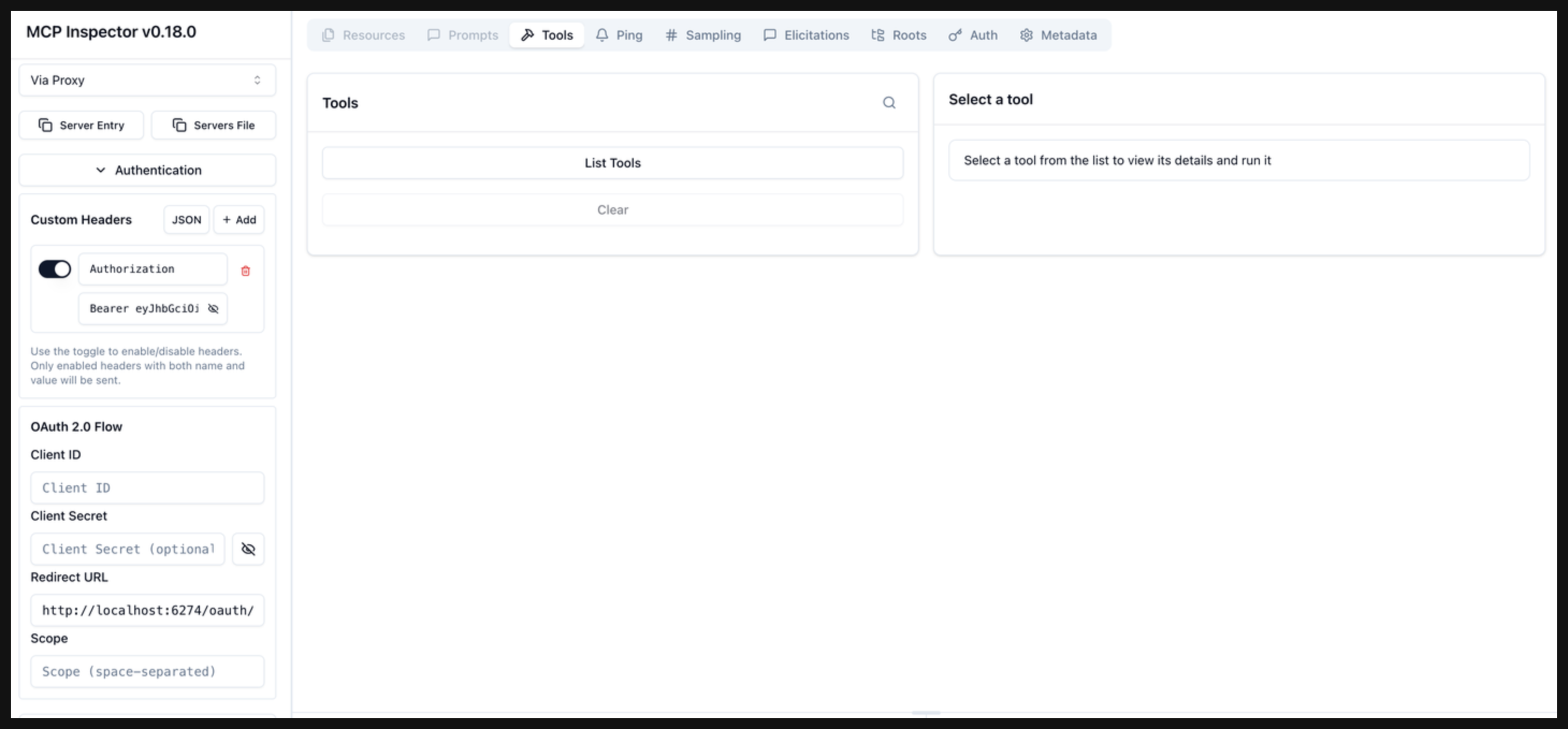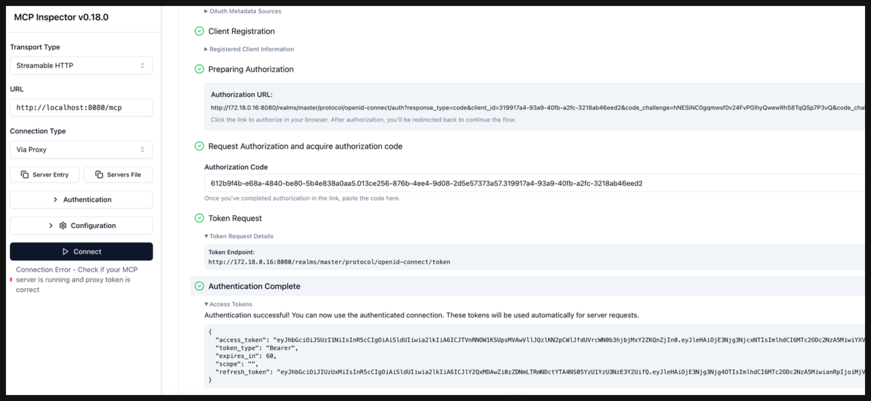 Click Open Auth Settings to run through the MCP Auth flow that you configured with the agentgateway proxy.